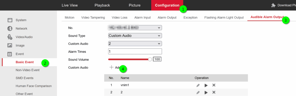 After uploading, select the file under Custom Audio dropdown and press Save at the bottom. You can test operation by pressing the play button under the operation column.