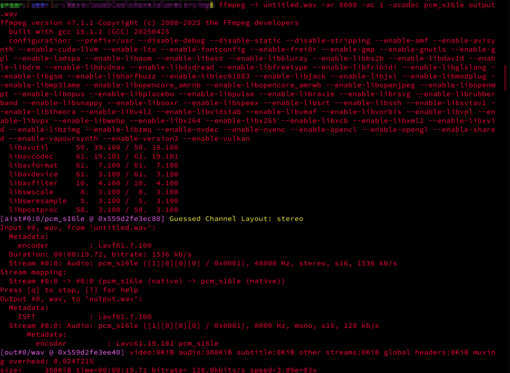 ffmpeg -i input_file -ar 8000 -ac 1 -acodec pcm_s16le output.wavThis should actually support any media format and is not limited to .WAV. So if you already have a sound you want to use that’s ready as a .mp3 or some type of video file you should be able to forego steps 1 and 2.